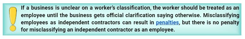 - Customary Engagement: The worker needs to have their own ongoing business with multiple customers, and the work done for the company has to be that same kind of work. (If an audio specialist with their own audio mixing company is hired to both operate the audio board and also to push boxes and build a stage, then the worker is an employee.)