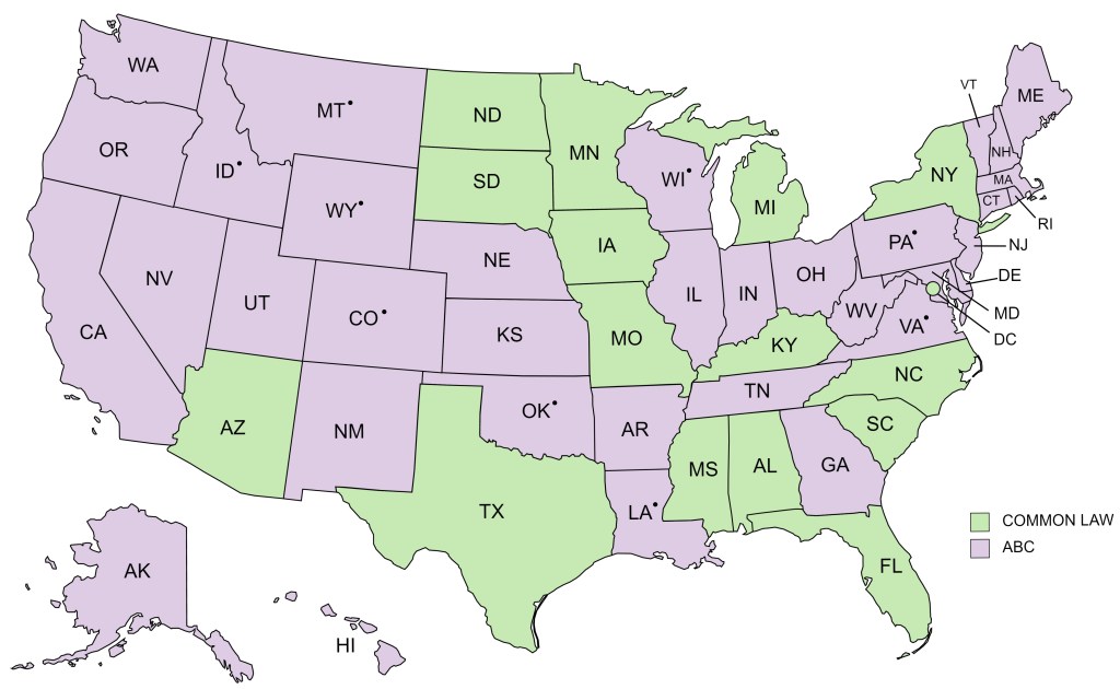 States using Common Law Test: AL, AZ, DC, FL, IA, KY, MI, MN, MS, MO, NY, NC, ND, SC, SD, and TX.