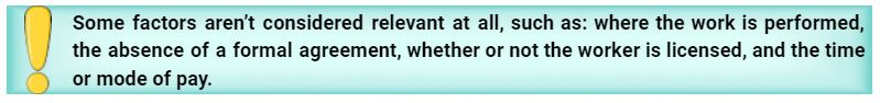 The keys for this test are to look at the entire relationship between the worker and the employer, and consider the extent of the right the employer has to direct and control the worker. All information which provides evidence of either control or independence must be considered. No single factor can determine whether a worker is an employee or an independent contractor. The IRS assumes the worker is an employee until it is proven otherwise.